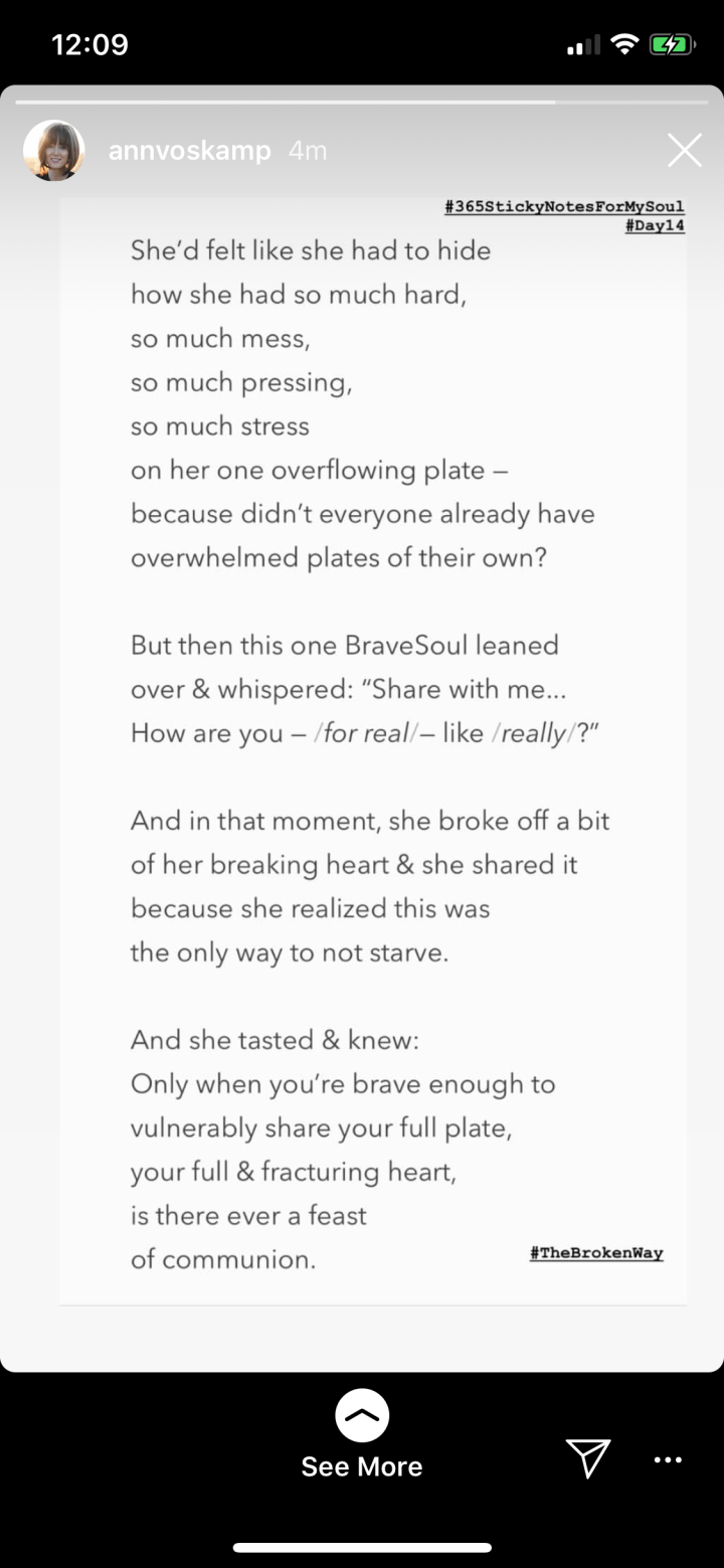 Sometimes I can’t sleep at midnight and I find poems and quotes that ignite writing ideas and projects to help me love people better. This is my initial take on an excerpt from Ann Voskamp’s book, “The Broken Way.” But then I dug in and asked some questions on Instagram, and had somewhat of a change of heart. I got answers I expected to get, and some I didn’t. Some answers made me sad, and some filled me up. I’m starting to put those pieces together and I still don’t have a real title for this little project, so, for now, I’m just going to call it, “Questions & Answers.” Below are my thoughts right after reading Ann’s post, but I know now that I have so much more to consider.