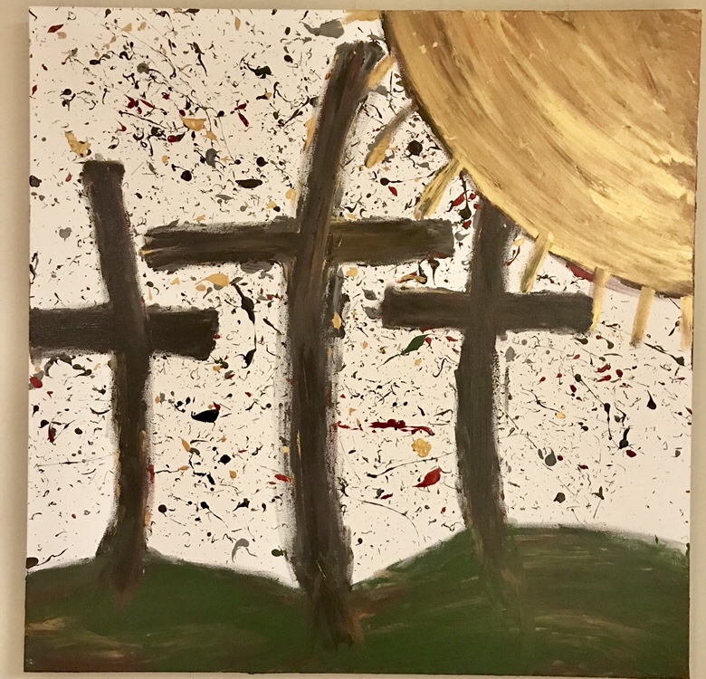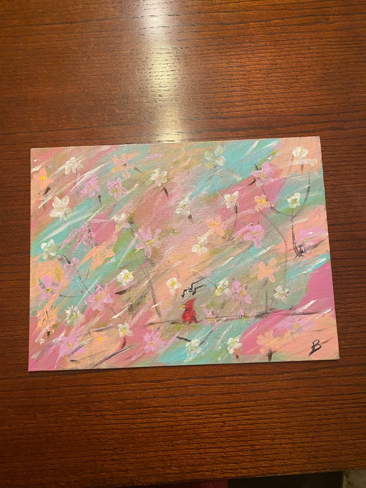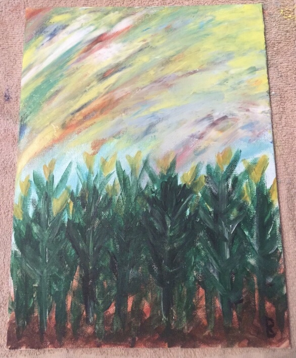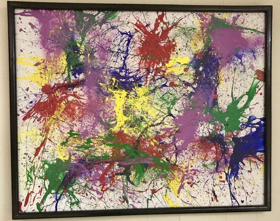 This was my very first splatter painting. I took it to the fair as my 4-H project. I filled balloons with paint, blew them up, and popped them over the flat canvas. My parents made me paint in the barn.